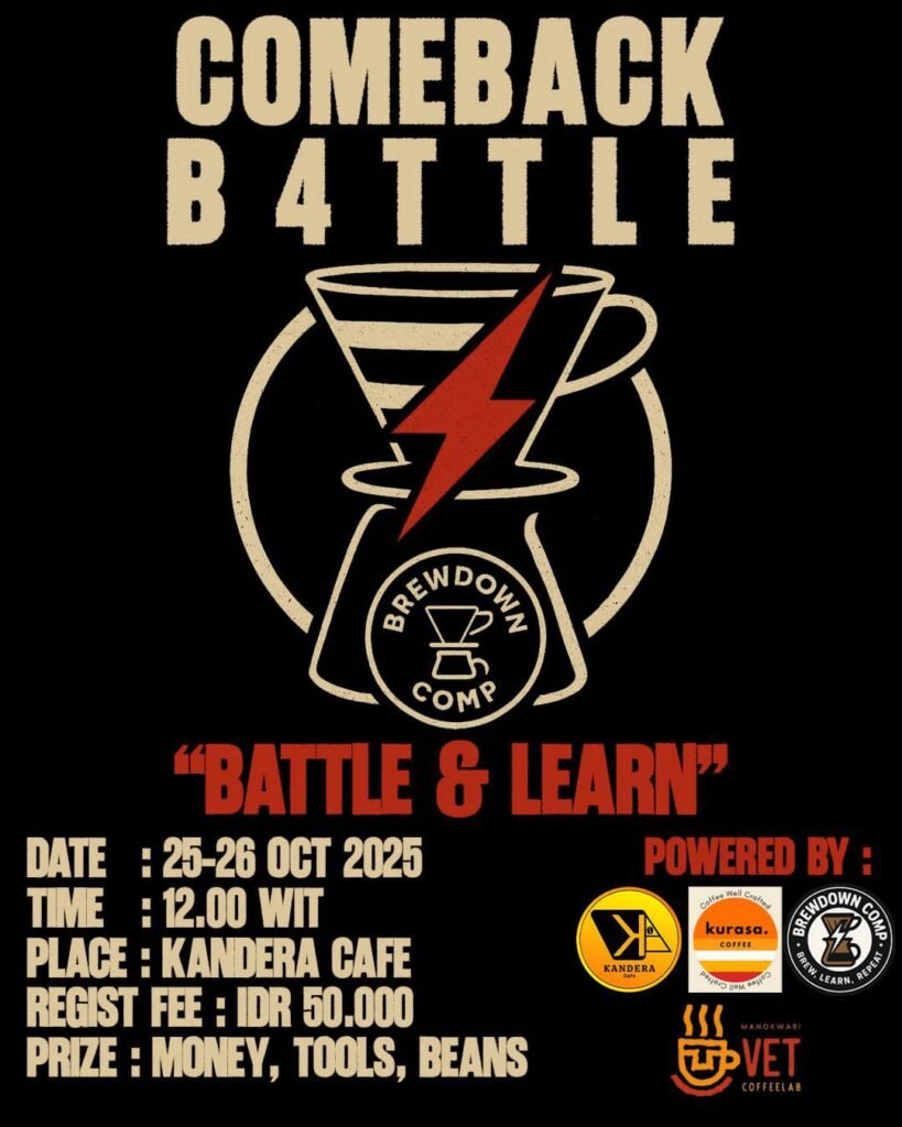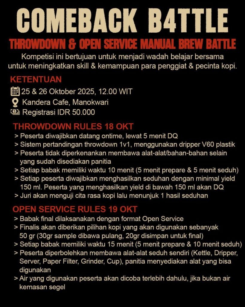 Papuatribune.com, Manokwari – Dalam rangka memperingati Hari Sumpah Pemuda tahun 2025, komunitas pecinta kopi di Kabupaten Manokwari menggelar kegiatan Brewdown Comp: Comeback Battle dengan tema “Battle & Learn”. Kegiatan ini berlangsung pada tanggal 25–26 Oktober 2025 di Kandera Café, Manokwari, mulai pukul 12.00 WIT.
